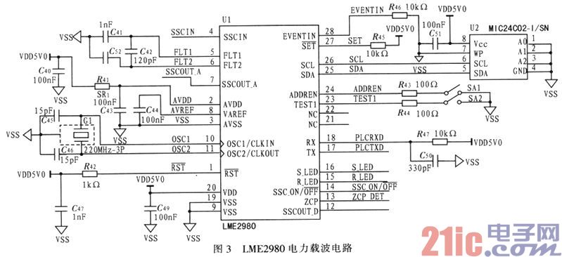 LME2980内置MCU,可运行用户定义的通信协议及应用软件。同时,LME2980内置模拟接收前端电路,大动态范围自动增益接收放大器等,外围电路简单,应用方案成本低,使用方便。LME2980电力载波电路如图3所示。