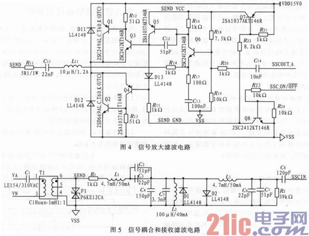 由信号耦合变压器T1和C11组成的高通滤波电路,用于隔离高电压的工频交流电,F1是12V的TVS管,用于消除来自电力线上的高频高强度干扰,从而保护内部电路。信号耦合和接收滤波电路如图5所示。