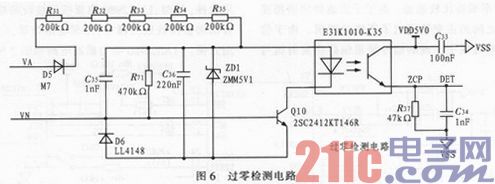 过零检测电路的功能是把工频交流电的过零时刻以脉冲的方式告知载波芯片,从而为分时通信以及相位判断提供依据。过零检测电路如图6所示。