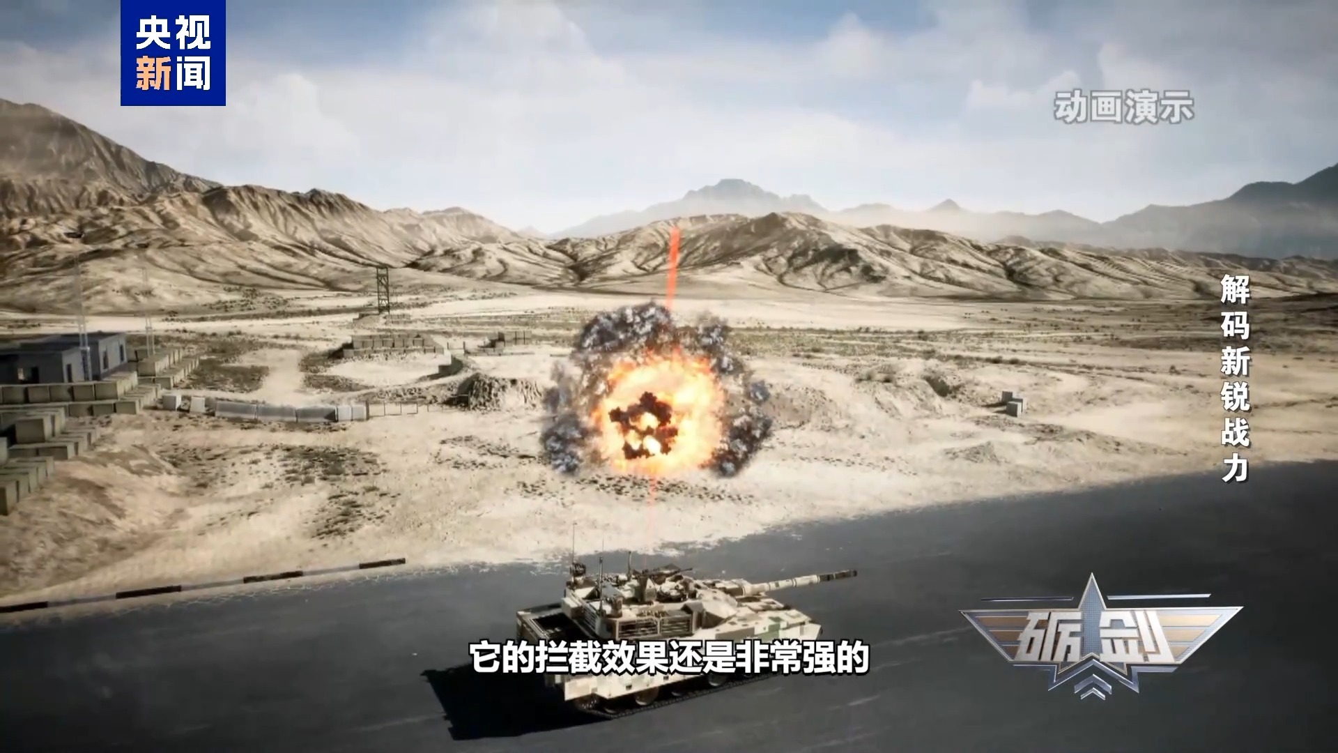 火箭弹拉着一条白线从空中向下飞来,快要击中靶车的一瞬间,被一股爆炸的火焰吞没,模拟攻顶弹药被成功拦截。