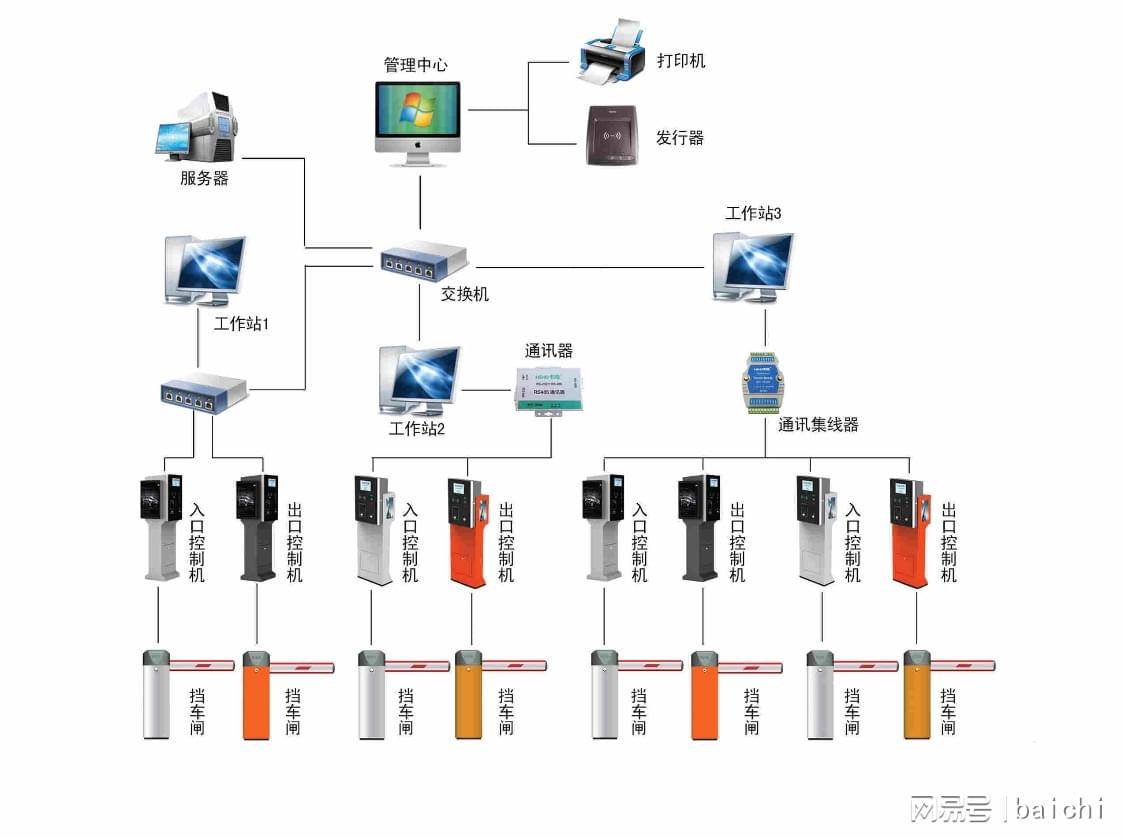 停车场管理系统的功能优势: 1) Internet 网管理功能; 2) 跟车提示功能; 3) 面板灯提示功能; 4) 脱机收费功能; 5) 单位车辆调度功能; 6) 多种卡相结合功能; 7) 自动识别系统功能; 8) 线) 道闸语音提示功能; 下图是车辆管理系统示意图:
