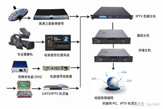 有线电视系统主要由信号源、前端、干线传输和用户分配网络组成。信号源接收设备向前端提供系统欲传输的各种信号。它一般包括开路电视接收信号、调频广播、地面卫星、微波以及有线电视台自办节目等信号。系统的前端部分的主要任务是将信号源送来的各种信号进行滤波、变频、放大、调制、混合等,使其适用于在干线传输系统中进行传输。系统的干线传输部分将系统前端部分所提供的电视信号通过传输媒体不失真地传输给分配系统。其传输方式主要有光纤、微波和同轴电缆三种。
