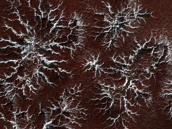 在火星上,到了春夏,干冰会从固态变成气态,并导致表面受到侵蚀,只留下刻在表面的类似蜘蛛一样的通道。