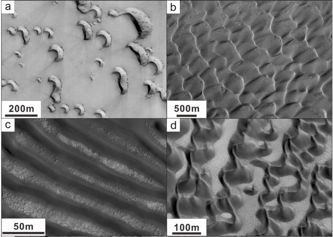 与地球相比,火星沙丘的地貌类型和形态明显简单许多。陕西师范大学行星风沙地貌学研究团队的董治宝教授指出,“火星沙丘几乎全部为简单沙丘,未见复合沙丘或复杂沙丘。而在地球上的主要沙漠则均有相当面积的复合和复杂沙丘。