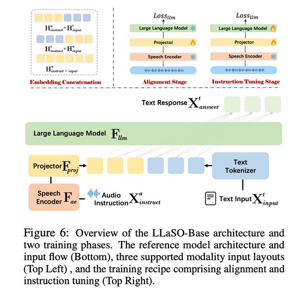 LLaSO-Base采用了已被验证的成功架构,由三部分组成:一个语音编码器(听觉)、一个投影器(转换)和一个大型语言模型(大脑)。